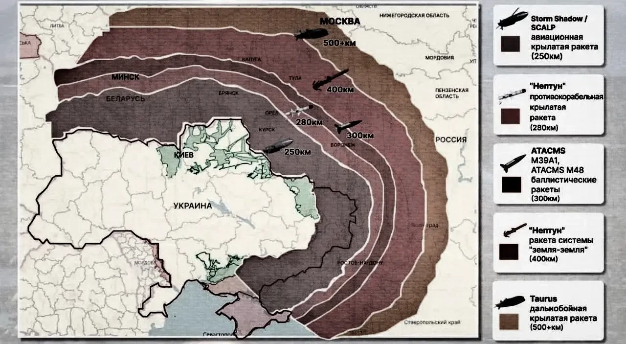 Зоны досягаемости различного украинского высокоточного оружия большой дальности. Изображение ТГ-канал «Рыбарь»