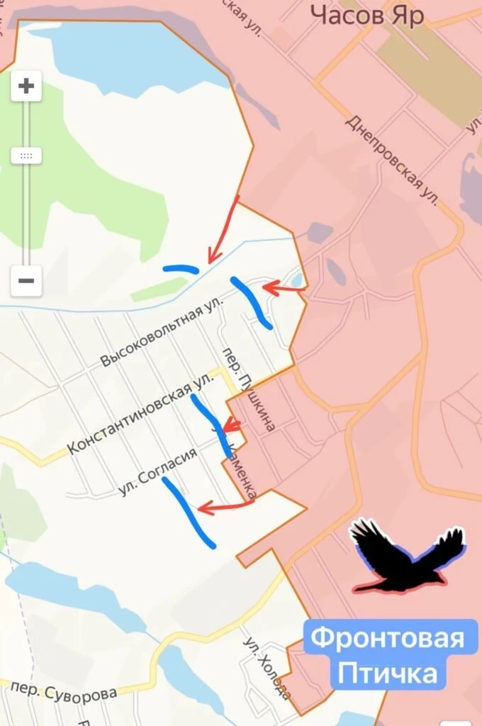 На Константиновском направлении продолжаются боестолкновения севернее Торецка в районе Дылеевки и Дачного. ВС РФ с опорой на Зарю ведут штурмовые действия в направлении Александро-Калиново. Российские войска продвинулись в западной части Яблоневки, давят в направлении центра. Продолжаются встречные бои в районе Попового Яра и южнее Полтавки.