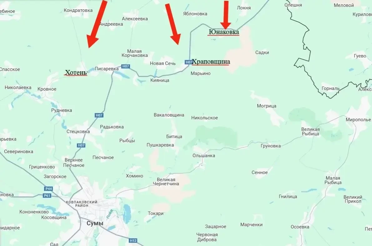 К северу от областного центра, города Сумы, наши силы продолжают расширять территорию владения, продвигаясь к новым населённым пунктам, одним из которых является село Хотень, что примерно в 11-12 километрах севернее Сум.