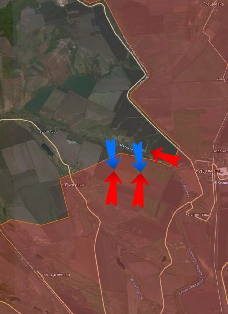 На западе от Торецка армия России в ожесточённых встречных боях выбила противника из Александро-Калиново и вошла еще и с восточной стороны в Яблоновку. Здесь за противником пока остаётся центральная и северо-западная части села. Около 600 м отделяет наши войска от Клебан-Быкского водохранилища, выход к которому позволит перерезать снабжение группировки ВСУ в Щербиновке - Петровке - Катериновке. К Катериновке армия России пробивается с юго-востока, создавая условия для окружения противника в Щербиновском «кармане». На востоке от Торецка, между Белой Горой и Курдюмовкой, российские подразделения разбирают ударами крупные вражеские опорники. Наши бойцы зачистили карман и выровняли линию фронта между Озаряновкой и Дылеевкой, сообщает в своём Telegram-канале Олег Царёв.