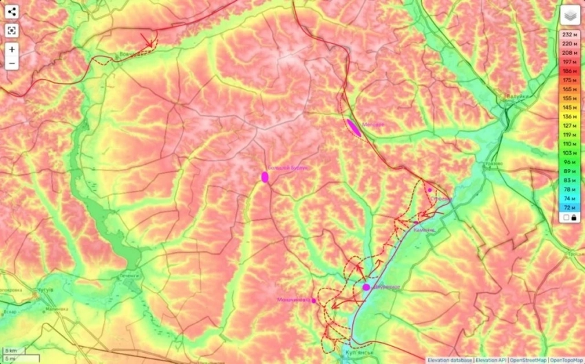 «После относительно непродолжительных штурмовых действий россияне сумели наскоком занять н. п. Меловое и многочисленные лесополосы западнее и южнее села. Данные действия призваны поддержать наступление войск противника на западном берегу реки Оскол. Вероятно, что ближайшие дни они предпримут удар на Бологовку или/или Отрадное, чтобы увеличить участок натиска вдоль реки Оскол», - пишет ТК.