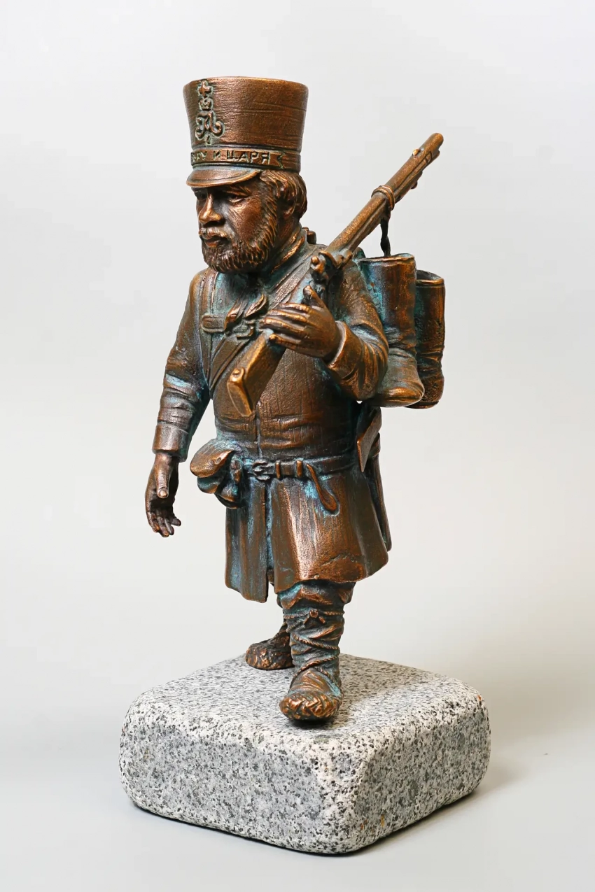 А вот это тоже фигурка ратника Пензенского ополчения, только отлита из бронзы, и это уже не «солдатик», а самая настоящая скульптура пензенского скульптора Германа Феоктистова. Называется «Молитва ополченца». Ну а то, что молились ополченцы постоянно и очень часто, известно очень хорошо. Крестьянам ведь с детства вбивали в головы, что «за царем служба, а за богом молитва не пропадают!»
