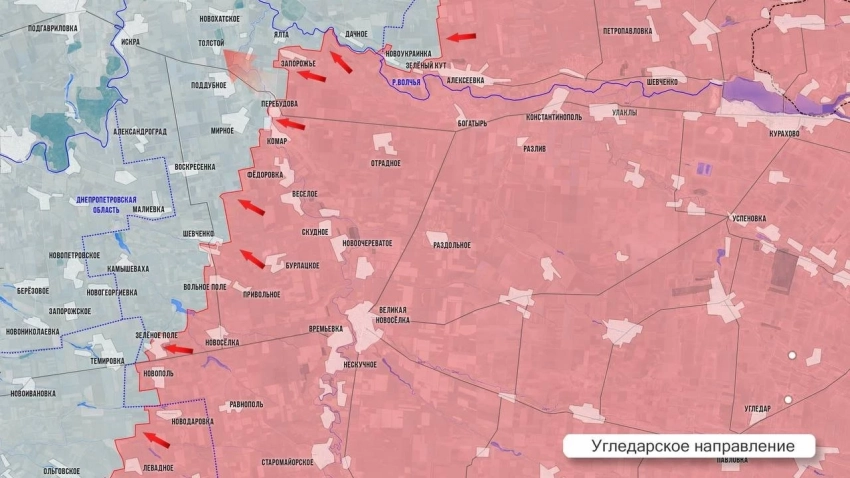 На Угледарском направлении ВС РФ освободили Поддубное – село в 5 км северо-западнее ранее освобожденного Комара и в 8 км к востоку от границы с Днепропетровской обл. Чтобы выйти на границу на этом участке, нашим войскам осталось взять село Андреевка-Клевцово. С мест сообщают и об освобождении села Толстой, а также форсировании реки Мокрые Ялы севернее Грушевского - так ВС РФ расширяют плацдарм на левом берегу реки Мокрые Ялы. Отсюда ВС РФ могут развивать наступление севернее линии Орехово-Новопавловка или южнее линий Шевченко-Малиевка или Шевченко-Камышеваха.