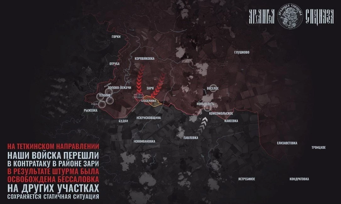 На Сумском направлении российская авиация наносит удары по позициям ВСУ, которые пытаются окружить морскую пехоту 40-й бригады в районе Кондратовки. Ещё одно направление, где украинские боевики пытаются провести «контрнаступ». ВСУ прекратили активные действия под Тёткино, уменьшив присутствие, включая 225 ошп. Атаки противника завершились контратакой наших войск и освобождением Бессаловки в Сумской области. Разведрота 56-го ДШП ВДВ действует глубже в тылу, уничтожая технику ВСУ. Крымские десантники подбили ББМ с пехотой под Соляниками, а дроноводы 56-го полка уничтожили замаскированный танк Т-80 у Гирино.