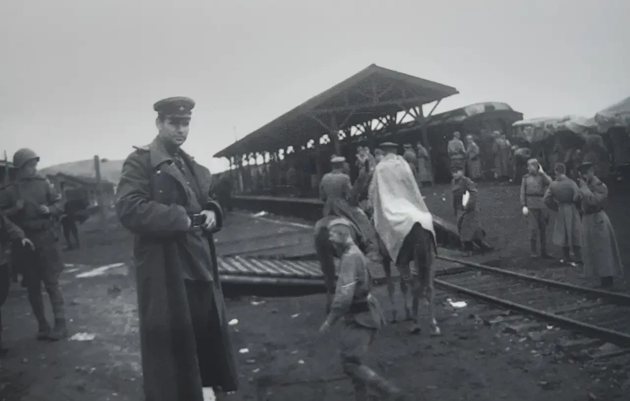 Станция Котон, видимо, после завершения боев. Под перронным навесом стоит пассажирский поезд. Серьезных боев за станцию не велось