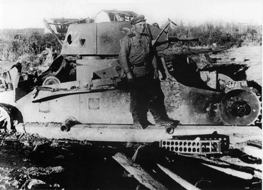 Подбитый Т-26. Судя по всему, попадание в лобовой лист корпуса. К моменту фотографирования с подбитого танка уже сняли все годные запчасти