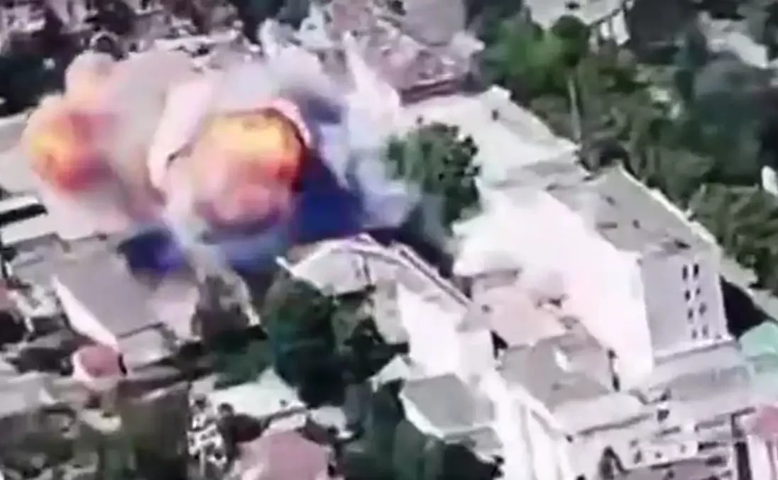 В сети распространяются кадры, на которых запечатлён точный прилёт двух КАБов прямо по вышеупомянутому зданию. Затем была заметна повторная детонация.
