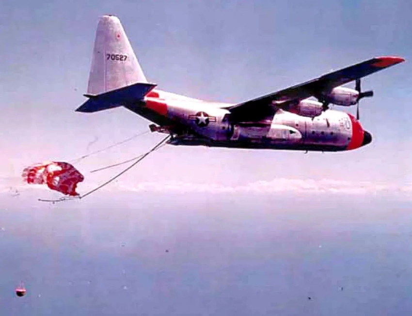 Самолет Lockheed JC-130B (57-0527) из 6593-й испытательной эскадрильи вылавливает парашют и полезную нагрузку в воздухе. Именно такой метод вылавливания предполагался для съемного контейнера полезной нагрузки, содержащего камеру, пленку и систему наведения D-21