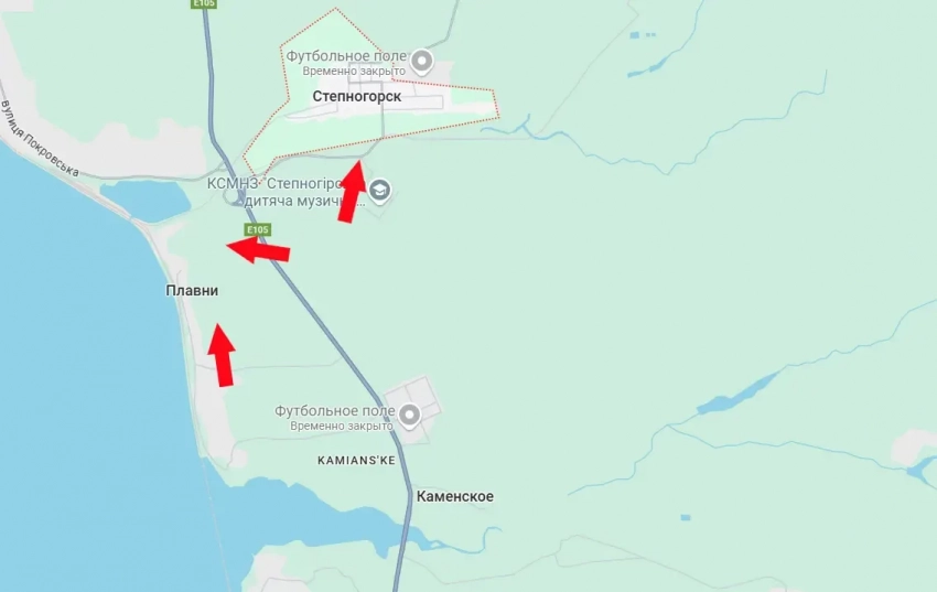 Противник «упирается» в Степногорске, однако российский манёвр по восточному берегу Каховского водохранилища если не застаёт его врасплох, то в любом случае создаёт дополнительную нагрузку на оборону всё в том же городе. При успешном выходе на северные рубежи Днепровских плавней ВС РФ могут осуществить охват Степногорска, отрезав его гарнизон от кратчайшей транспортной связи с Запорожьем. Речь идёт об автомобильной дороге Е105. По прямой от Степногорска до южных окраин Запорожья - 20 км.