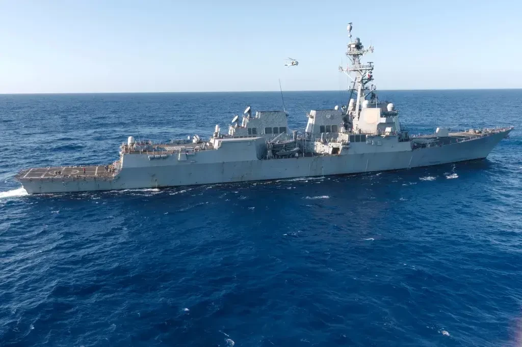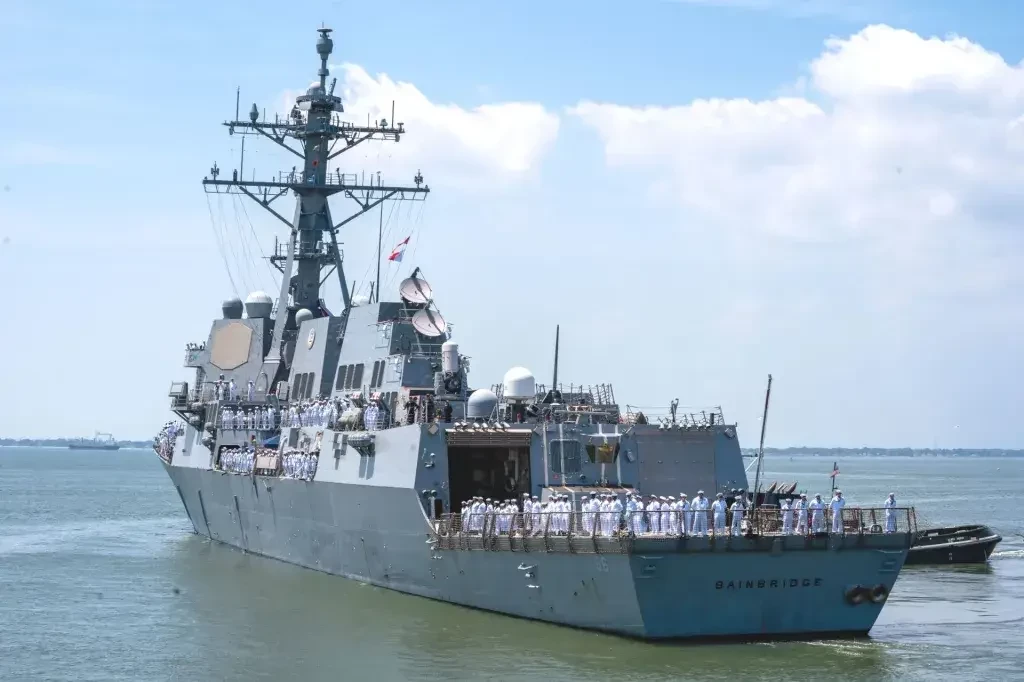 Военно-морской флот США опубликовал фотографию эсминца «Бейнбридж», плывущего по Ионическому морю между Италией и Грецией, снимок был сделан 27 июля 2025 года. Это один из трёх эсминцев класса «Арли Бёрк», в настоящее время приписанных к авианосной ударной группе авианосца «Джеральд Р. Форд», наряду с однотипными эсминцами «Уинстон С. Черчилль» и «Митчер». «Уинстон С. Черчилль» выполняет функции командующего противовоздушной обороной ударной группы, роль, которую эсминцы класса «Арли Берк» все чаще берут на себя из-за сокращающегося флота стареющих крейсеров класса «Тикондерога».