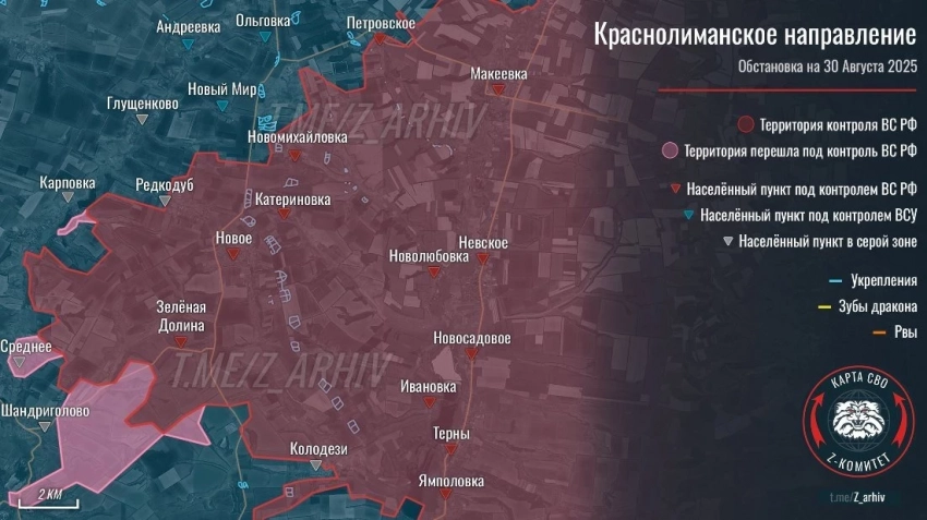 На Краснолиманском участке ВС РФ взяли почти всю восточную часть и ведут бои в центре Заречного. Южнее Колодезей наши физически перерезали дорогу Дробышево - Заречное и атакуют юго-восточнее Мирного и район дамбы. Выше по фронту наши на 5 к приблизились к Дерилово. Отразили утренние контратаки ВСУ в районе Редкодуба и Шандриголово. Зайдя в Глущенково, наступают на Малиевку и Андреевку, а чуть южнее вышли к дороге на Новый Мир. По последним данным, наши пытаются закрепиться южной части Дружелюбовки и вошли в Ольговку.