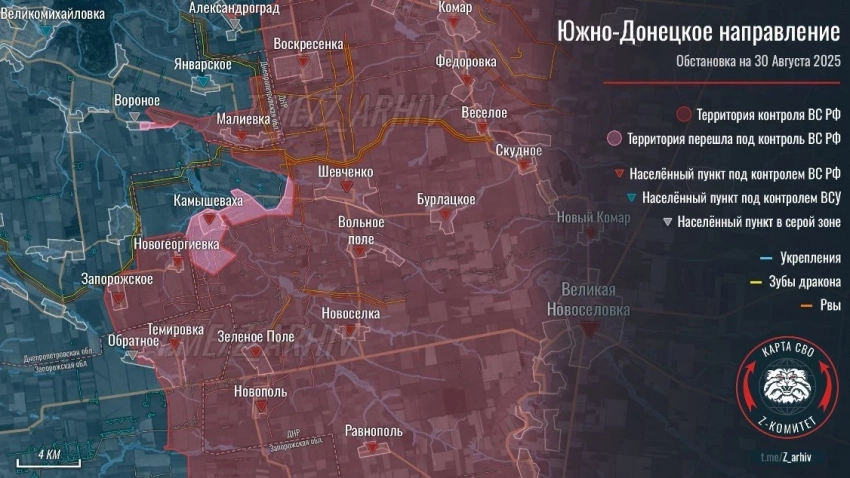 В зоне СВО продолжается мощное наступление российских войск. Наш сайт N4k предлагает ознакомиться с последними новостями из зоны проведения СВО, а также публикует свежую карту боевых действий, актуальную на сегодняшний день, 31.08.2025.