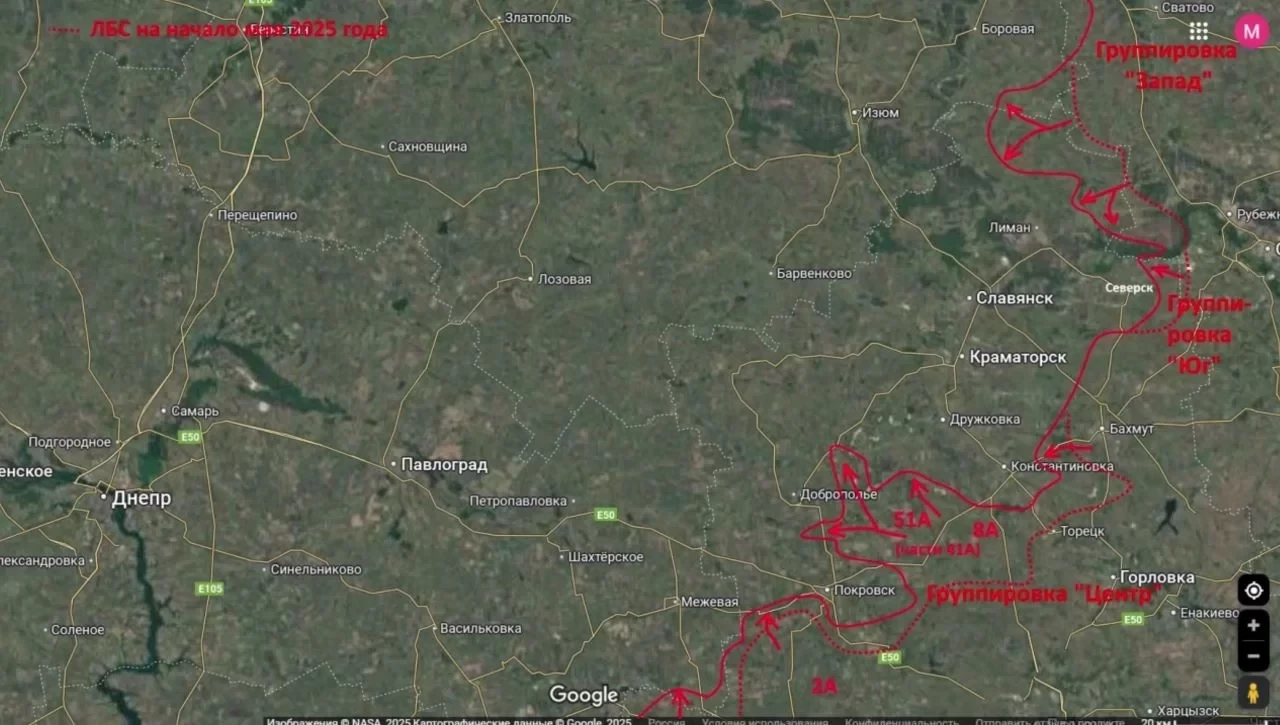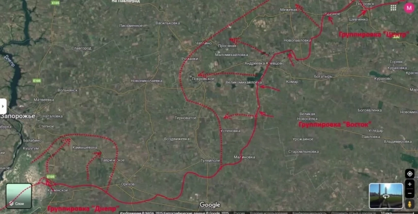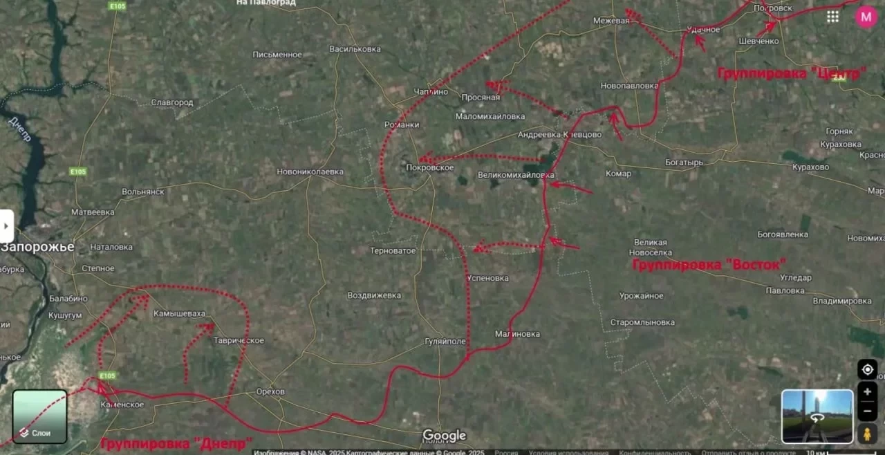Одновременно с этим группировка «Восток», динамично наступавшая в течение всего лета, продолжает движение в сторону Покровска. Совместные действия двух группировок могут создать предпосылки для оперативного окружения крупной группировки ВСУ в районе Орехова и Гуляйполя.
