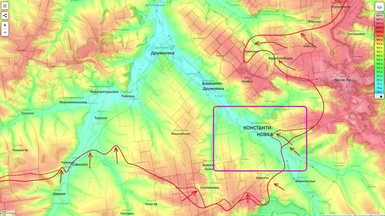 На Константиновском направлении фиксируется начительный прогресс достигнут у Степановки. Российские войска подошли к окраинам села, взятие которого станет ключом к дальнейшему охвату Константиновки. В самом городе наши штурмовые группы просачиваются в жилую застройку, расширяя зону контроля.