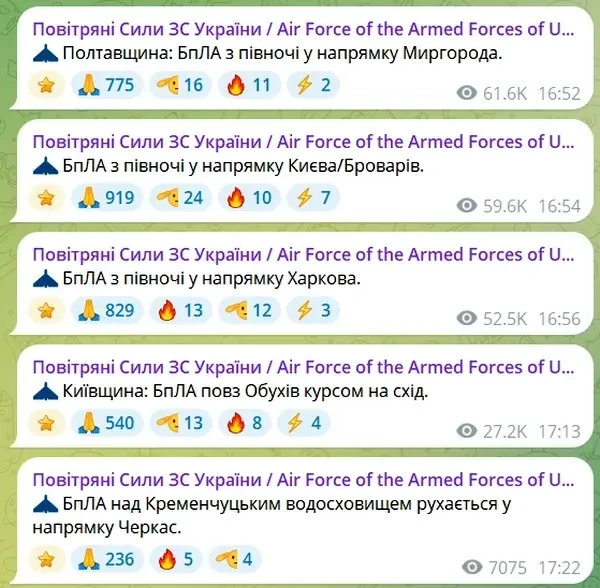Между тем, атаки ВС РФ продолжаются, что подтверждает и пополняющаяся сообщениями в среднем каждые 5 минут лента официального паблика Воздушных сил ВСУ. Дроны летят в направлении Киева, Кременчуга, Черкасс, Миргорода, Харькова и так далее по списку.