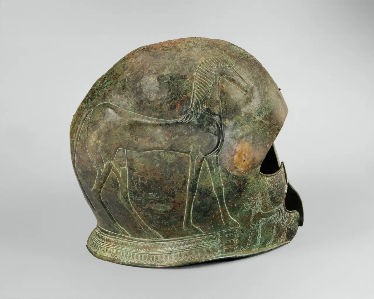 Бронзовый шлем с двумя длинноногими лошадьми, выполненными в технике чеканки с резными деталями; на нащечниках — маленькие гравированные львы. Высота 24, 5 см. Найден на острове Крит. Конец VII века до н. э. Метрополитен-музей, Нью-Йорк