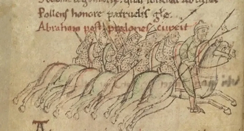 Иллюстрация с изображением всадников в кольчугах и шлемах с бармицами. «Психомахия», X век. Британская библиотека, Лондон
