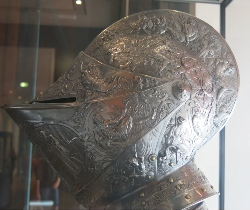 Доспехи украшены дельфинами, обращёнными друг к другу. Музей армии. Париж