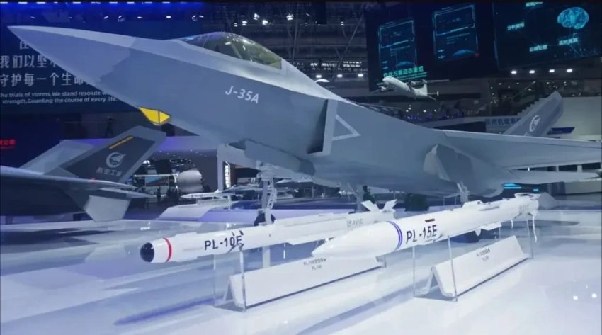 PL-15E и PL-10E на фоне истребителя J-35A на авиасалоне в Чжухае, 2024 год