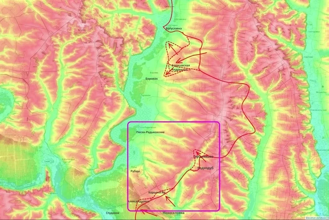 Бойцы армии Российской Федерации стремятся выйти к Пескам-Радьковским, чтобы сухопутно отрезать гарнизон Боровой, уточнил Юрий Подоляка в своей последней сводке.