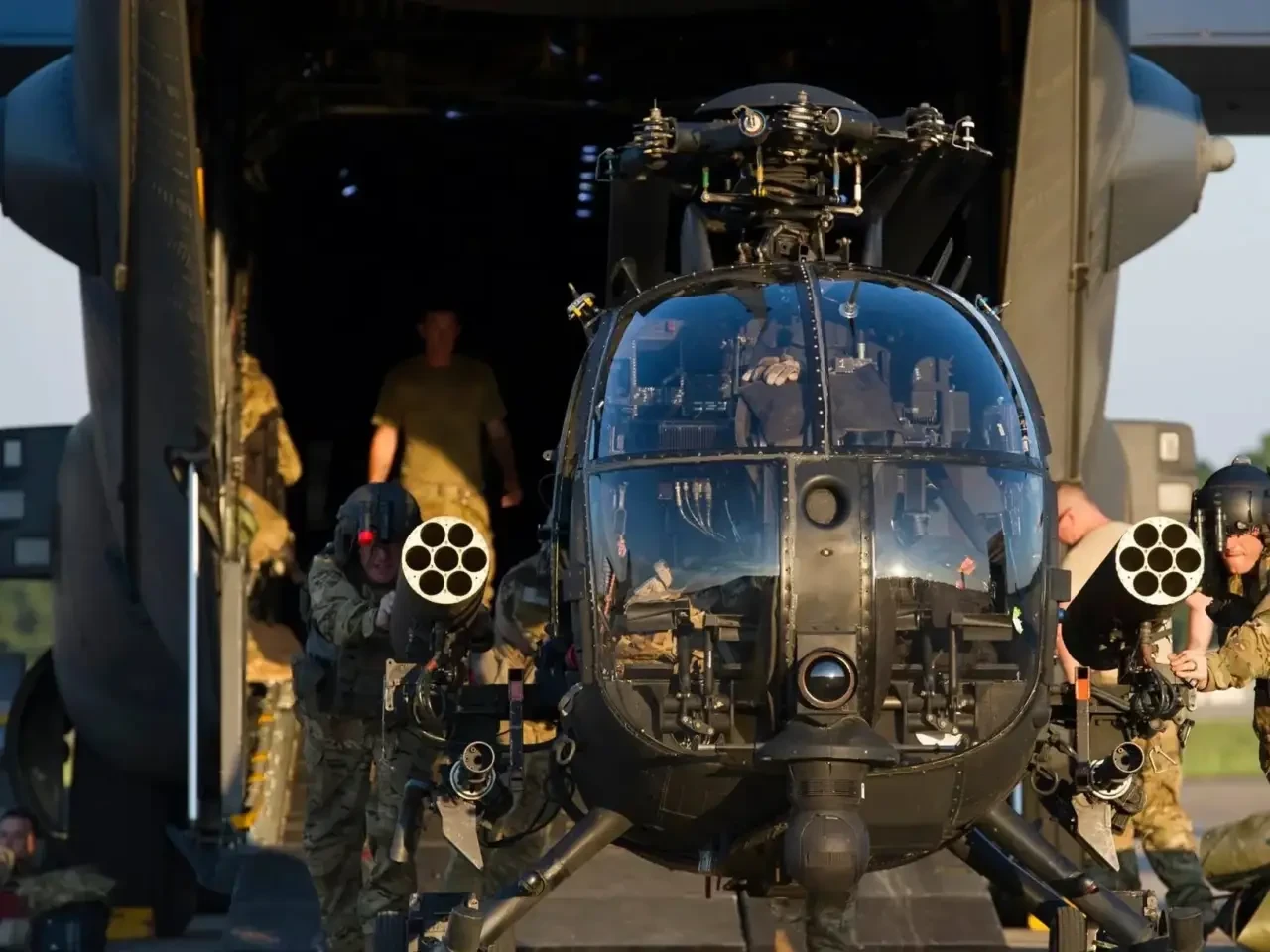 Выгрузка вертолёта AH-6 из военно-транспортного самолёта C-130