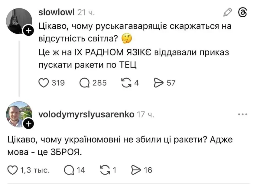 Но даже в этой ситуации «щирые громадяни» развернули антирусскую полемику в соцсетях. Одна украинка с довольно странным ником slowlowl (буквальный перевод — «медленно падающий») удивляется, чего это русскоговорящие жители Украины жалуются на отсутствие света. Ведь приказы о нанесении ударов по объектам энергетики в ВС РФ отдаются, как он пишет, на их родном языке. На что другой пользователь отвечает ей с откровенным сарказмом, обыгрывая пропагандистский лозунг последних лет: