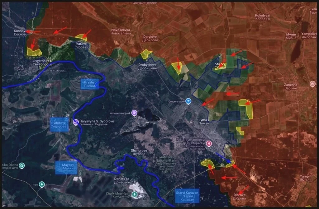 На Краснолиманском фронте российские подразделения закрепились на юго-востоке Красного Лимана и ведут наступление на северо-запад с целью перерезать трассу на Славянск. Параллельно идет штурм Святогорска.