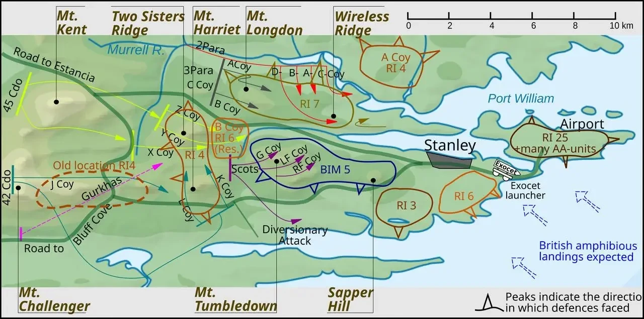 2-й парашютно-десантный батальон передали в 5-ю бригаду бригадного генерала Тони Уилсона, который хотел атаковать всеми силами на узком фронте у горы Харриет на юге, чтобы подготовить почву для штурма внутреннего периметра. Джулиан Мур считал этот образ действий опасным, поскольку наступление узким фронтом поставит войска под перекрёстный огонь с неприступных возвышенностей. В результате план Томпсона был принят с изменениями: 3-я бригада коммандос должна была наступать на севере Восточного Фолкленда, а 5-я бригада — на юге, что должно было сбить аргентинское командование с толку, не позволяя определить: где наносится главный удар? Потом бригады ударами с двух сторон захватывают высоты перед Порт-Стэнли. Вот только с логистикой при этом возникали большие проблемы: потопление «Атлантик Конвейера» продолжало напоминать о себе изрядными неудобствами.