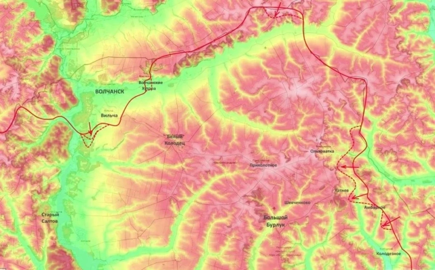 Параллельно группировка, наступающая со стороны Волчанска, прорывает оборону вдоль восточного берега Северского Донца в обход Белого Колодезя. Замысел командования - соединить эти две группировки, обрушить оборону и выйти на оперативный простор.