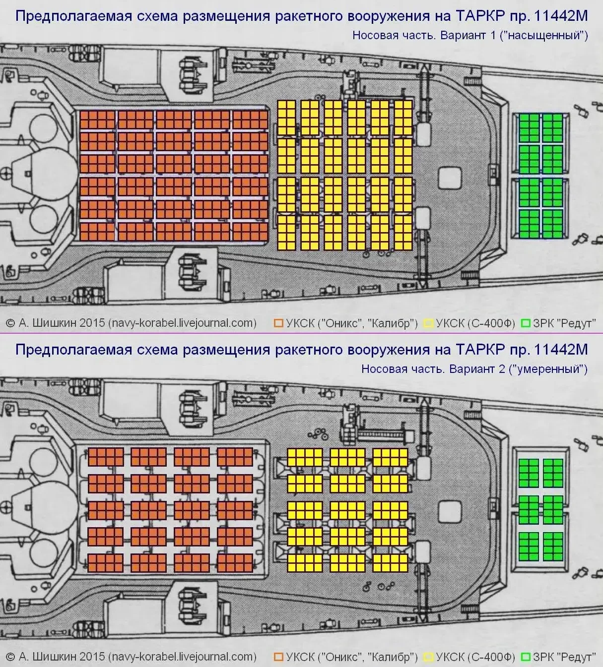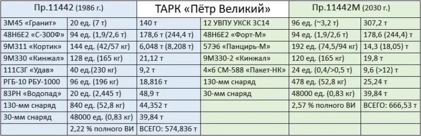 По факту модернизации ТАРК «Адмирал Нахимов» в объёме, который занимали 20 ПУ и 20 ракет «Гранит», теперь размещены 10 ВПУ УКСК 3С14 и 80 ракет различного назначения в транспортно-пусковых стаканах. Вес нового боекомплекта в том же объёме ориентировочно можно оценить в 256 тонн. Вплоть до начала модернизации рассматривались различные предложения и варианты количества пусковых установок ударного вооружения крейсера.