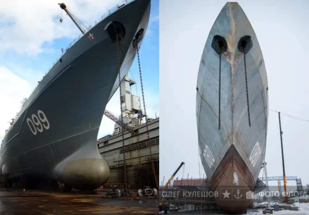 Всё это визуально будет выглядеть следующим образом: исчезает наклон верхней палубы в носовой оконечности; наклон форштевня от горизонтали увеличивается с 45 до 60 градусов; естественно, в более широкую часть верхнего корпуса перемещаются якорные клюзы. Изменятся и тактико-технические параметры: из-за упомянутого уже значительного сокращения веса в носу уменьшатся углы размаха килевой качки; фактически исчезают углы закрытия для ведения огня в носовую оконечность для ЗРПК «Панцирь»; сокращение общих геометрических размеров по длине и высоте повлечёт уменьшение общей ЭПР корабля и парусности. К тому же предполагаемая замена ракетного комплекса противоторпедной защиты «Удав» с его трёхъярусным помещением для хранения боекомплекта, его подачи на заряжание ПУ, которая расположена на верхней палубе, станет ещё той головоломкой для проектировщиков, чтобы переделать всё для установки побортно двух ПУ СМ-588 комплекса «Пакет-НК», для которых необходимы лацпорты. Легче перепроектировать для удобства и рациональности и построить заново.