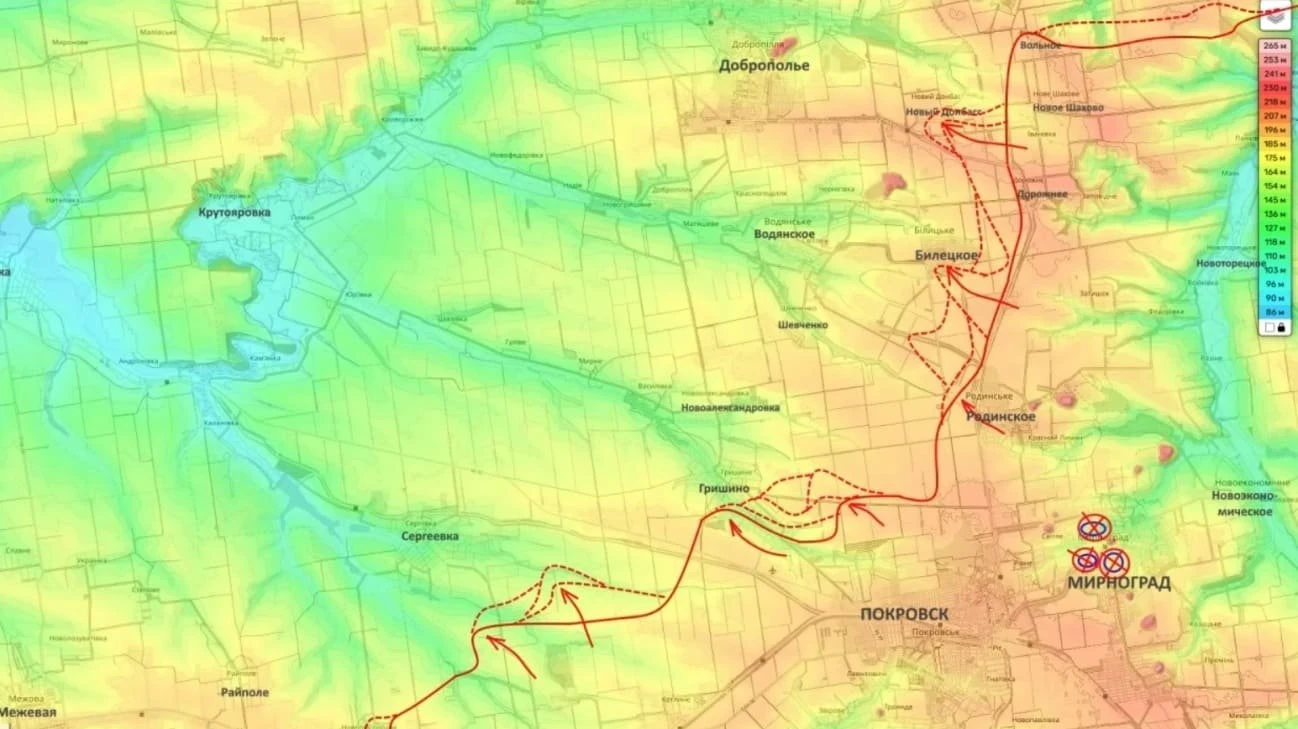 Он пояснил, что границы наступательного участка начинаются от поселка Удачное в Покровском районе и протягиваются до села Шахово, расположенного на востоке от Доброполья. Протяжённость составляет около 40 километров.