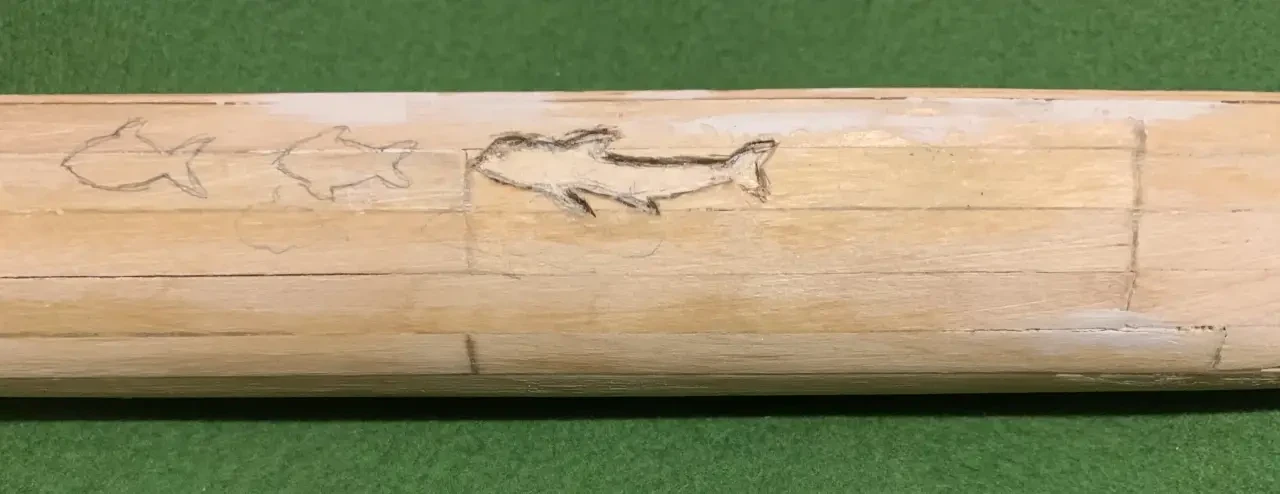 Готовый корпус сначала ошкуривался. Затем шпаклевался, при этом использовалась смесь ПВА и мелких опилок. После чего обработанный таким образом корпус снимался с пластилиновой формы, и к нему спереди и сзади, по фотографии модели Френсиса Пиммеля, пристыковывались вытянутые вверх оконечности. Изнутри корпус прямо по бумаге отклеивался рейками из ольхи шириной 3 мм.