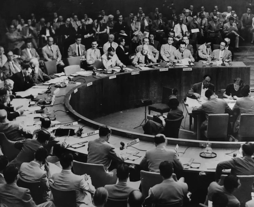 То самое заседание Совета Безопасности ООН, пустое кресло слева - советского представителя