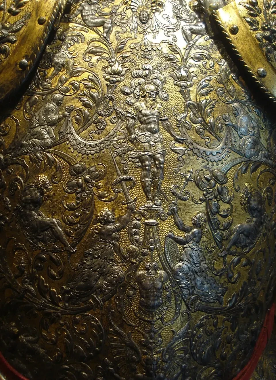 Вот и на доспехе Генриха II мы встречаем как изображения человеческих фигур, так и различные фантастические существа. Последние, по-видимому, были созданы не без влияния итальянского гротеска, в частности работ таких скульпторов, как Франческо Приматиччо и Бенвенуто Челлини, которыми для Генриха II создали целый ряд скульптур.