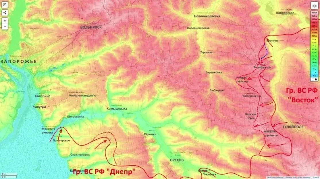 В перспективе, считает блогер, может рассматриваться вариант охвата Ореховской группировки и дальнейшего продвижения в сторону Запорожья. По его словам, такой сценарий возможен при условии подготовки соответствующей оперативной базы.