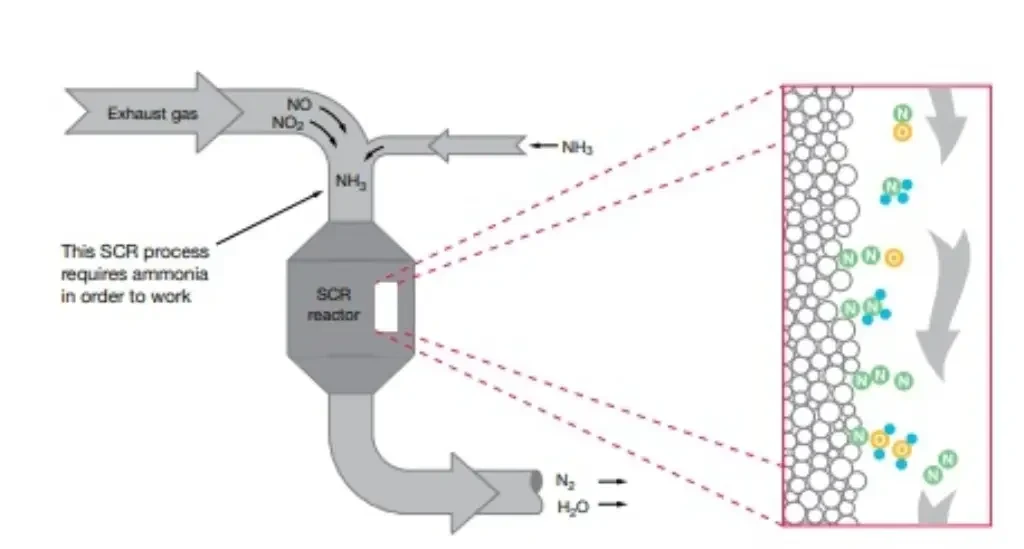 Для соответствия Tier III по содержанию NOx используется технология SCR. Технология SCR представляет собой процесс доочистки выхлопных газов, при котором оксиды азота (NOx), образующиеся в процессе сгорания, удаляются из отработавших газов путем каталитического восстановления. Обычно в качестве каталитического агента можно использовать аммиак (восстановитель), который впрыскивается в отработавшие газы. Потребление аммиака в системе SCR будет очень малым по сравнению с потреблением аммиачного топлива. В ходе каталитической реакции NH3 and NOX превращаются в азот (N2) и воду (H2O): 4NO + 4NH3 + O2 → 4N2 + 6H2O; 6NO2 + 8NH3 → 7N2 + 12H2O.