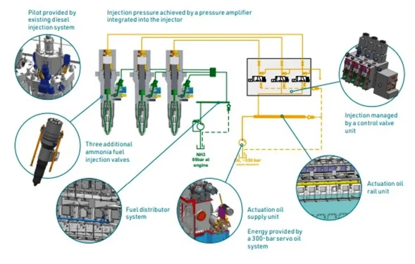 Основным конструктивным отличием «аммиачных» двигателей от работающих на обычных видах топлива является их система топливоподготовки и топливная аппаратура. У всех упоминаемых в данной статье двигателей используется система непосредственного впрыска жидкого аммиака в камеру сгорания под высоким давлением (300–600 бар и более) в конце такта сжатия. Высокое давление впрыска (HPCR) улучшает распыление аммиака, снижает уровень несгоревшего аммиака (slip) и позволяет достичь высокой термической эффективности. При этом обычно для подачи аммиака к форсункам применяется система Common Rail.