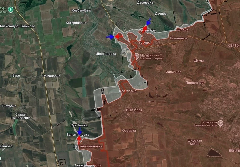На западном фланге Торецкого направления сообщают о встречном движении ВС РФ из Пантелеймоновки в сторону Зелёного Поля. В районе Валентиновки и Сухой Балки позиционные бои. В самом Торецке бои у Щербиновки и к северу от города.