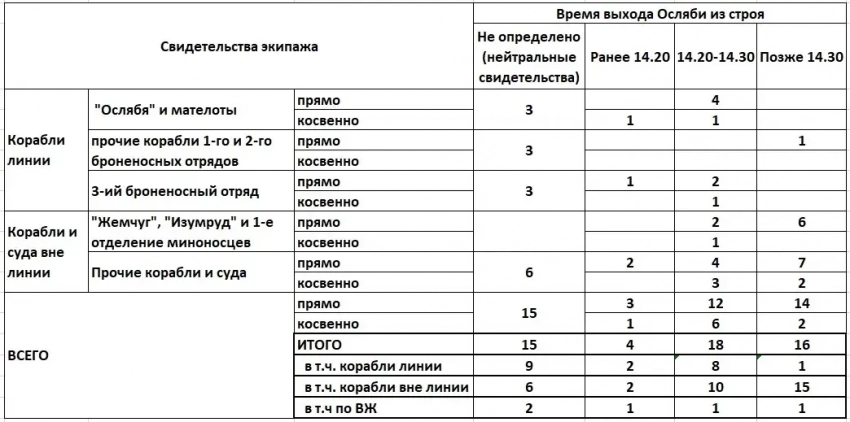 И наоборот, большая часть свидетельств членов экипажей кораблей, находившихся вне боевой линии (группы №№ 4-5), указывают на то, что «Ослябя» вышел из строя после 14:30 (15 против 10 свидетельств за промежуток времени 14:20-14:30 и 2 за более раннее).