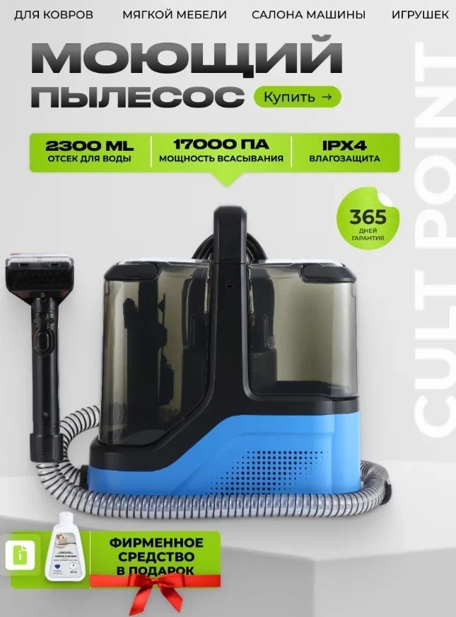 Моющий пылесос для дома Cult Point для мебели и ковров, автомобилей, игрушек, аквафильтр, мощность всасывания 17 000 Па