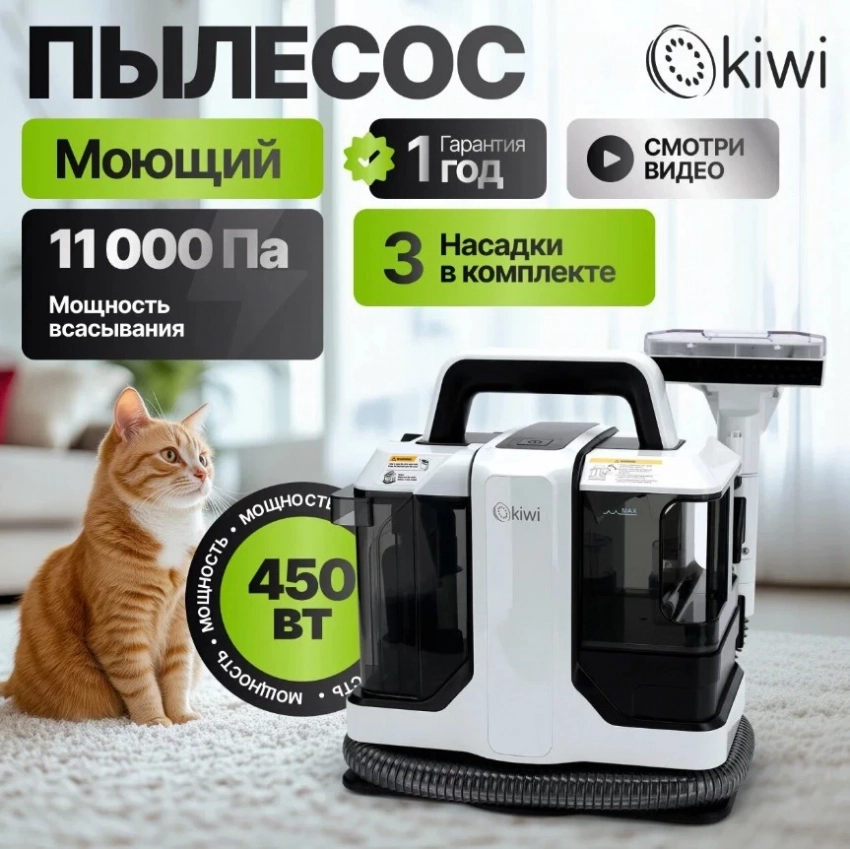 Моющий пылесос KIWI KCC-4322 для химчистки ковров, мягкой мебели, салона авто, мягких игрушек, для всех видов загрязнений