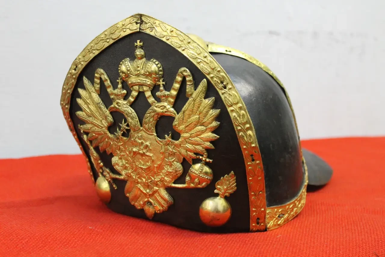 Митра офицера конных гренадеров Лейб-драгунского полка Гоштинской гвардии Петра III. Ткань, дерево, бронза, золочение, эмаль, краска. Диаметр основания 191 мм. Высота 297 мм. Материалы: сукно, дерево, бронза, позолота, эмаль, краска. Особенностью ее оформления являются целых три герба! Двуглавый орел в верхней части и два герба под ним. Российский справа, и герб Петра III - наследственный голштейн-готторпский герб слева. Внизу новый вензель – одна буква «П» на голубой эмали. Наверное, это самая красивая митра за всю историю их использования в российской армии. Пензенский областной краеведческий музей. Фотография автора