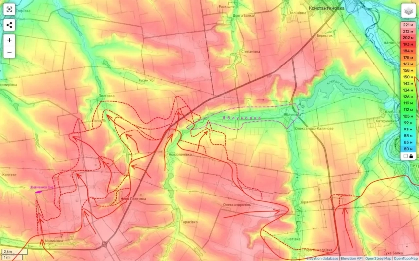Вместе с этим имеет место продвижение Вооружённых сил России в Полтавке и в сторону Русиного Яра. В свою очередь в районе Яблуновки бойцы ВС РФ постепенно занимают поля, расположенные южнее этого населённого пункта.