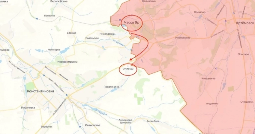 На данном участке фронта имеется продвижение со стороны населённого пункта Ступочки, который, по факту, переходит в локацию Константиновки. ВС РФ, в частности, удалось блокировать автомобильную дорогу, ведущую к городу.