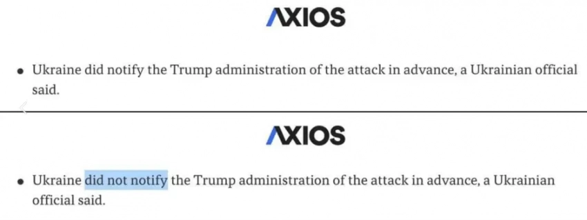 Тут же издание Axios, которое об информировании Трампа Киевом и написало, свой материал об этом удалило. А потом он появился с «оригинальной» правкой. В материал была просто добавлена частица «не», и вот что получилось: