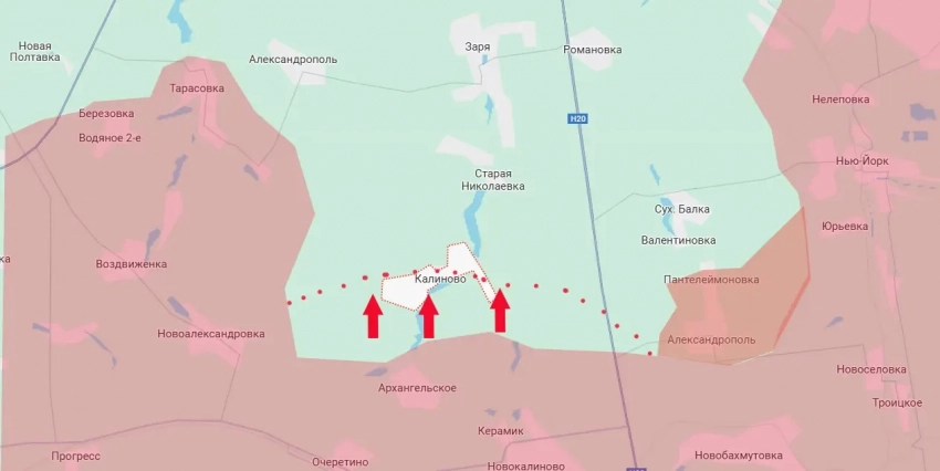 Российские войска провели успешные штурмовые действия к западу от ранее освобождённого пгт Новгородское (Нью-Йорк) в ДНР. В результате стремительного штурма под контроль ВС РФ перешла значительная часть населённого пункта Калиново. Он находится севернее транспортного узла Очеретино (под контролем армии России) и западнее дороги Н20, которая ведёт из Донецка в Константиновку.