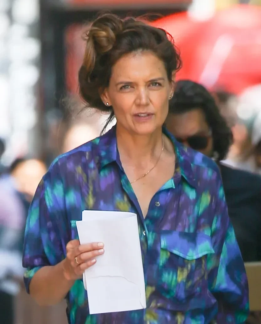 Сури надела на прогулку брюки карго и белый топ, дополнив образ красными кроссовками. Кэти Холмс, вероятно, была одета в костюм для съёмок.