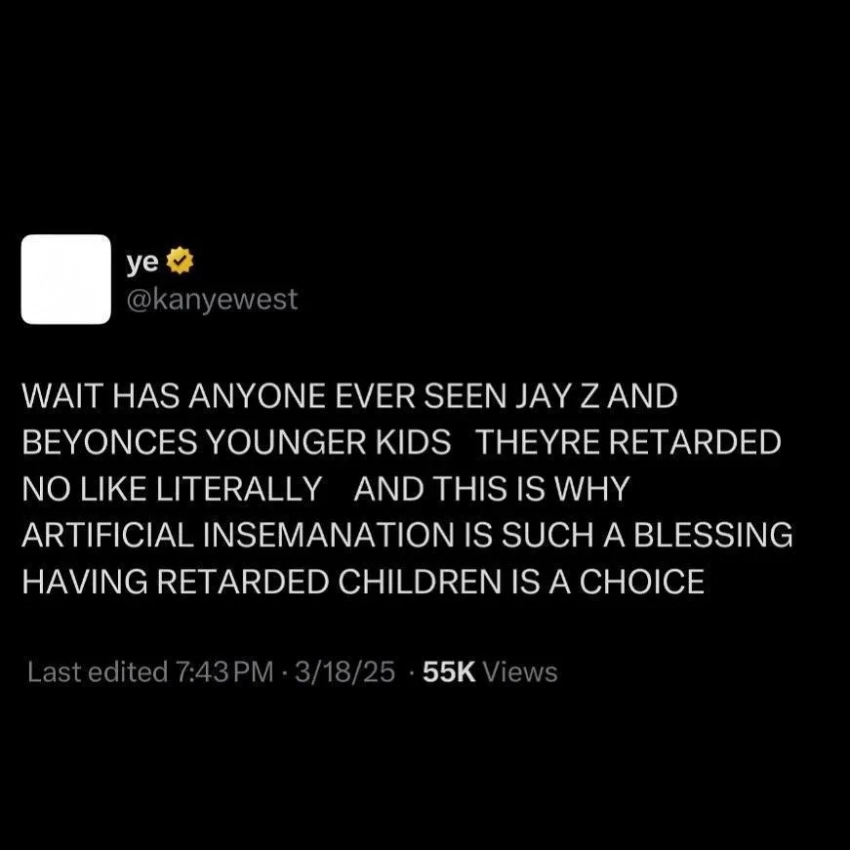 Джей-Зи и БейонсеНапомним, что недавно Канье Уэст опубликовал новый пост в X (бывший Twitter), написав: "Подождите, кто-нибудь когда-нибудь видел младших детей Джей-Зи и Бейонсе? Они же буквально недоразвитые. Вот почему искусственное оплодотворение — благословение. Рождение отсталых детей — это выбор". Позднее он удалил публикацию, пояснив, что сделал это не чтобы "быть хорошим человеком", а потому что его аккаунту грозила блокировка.