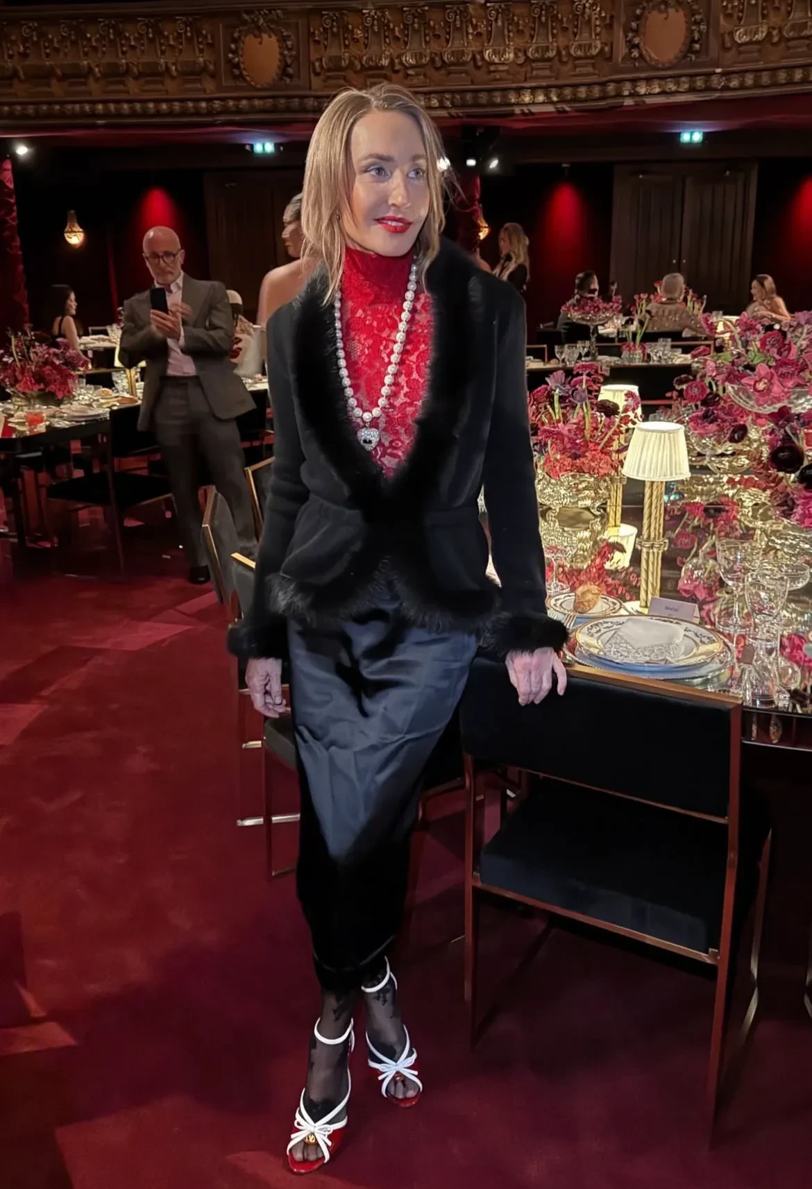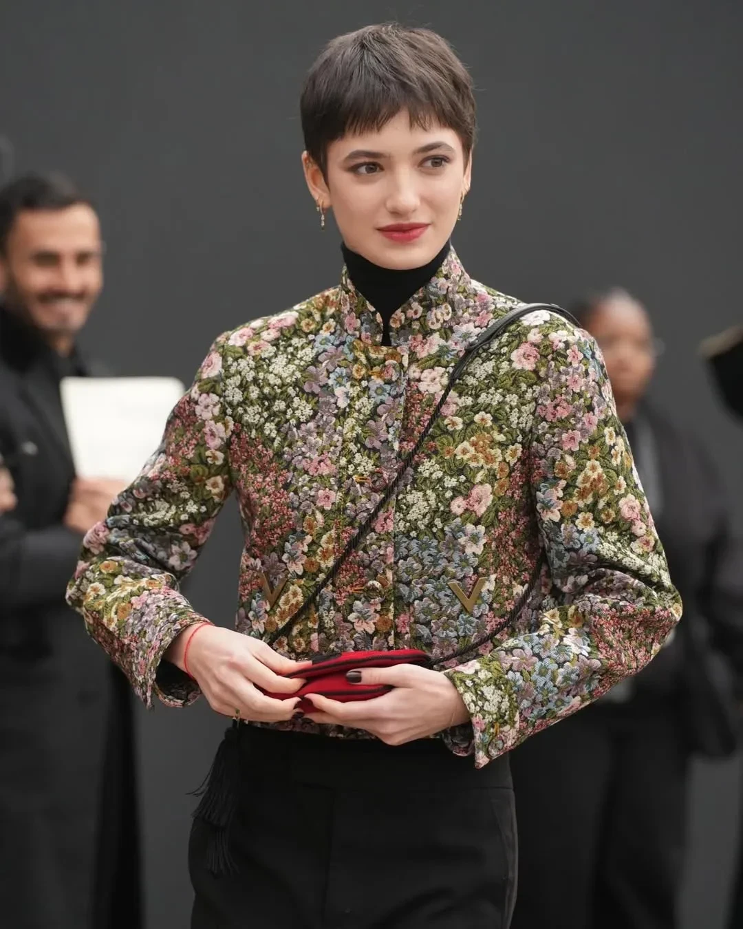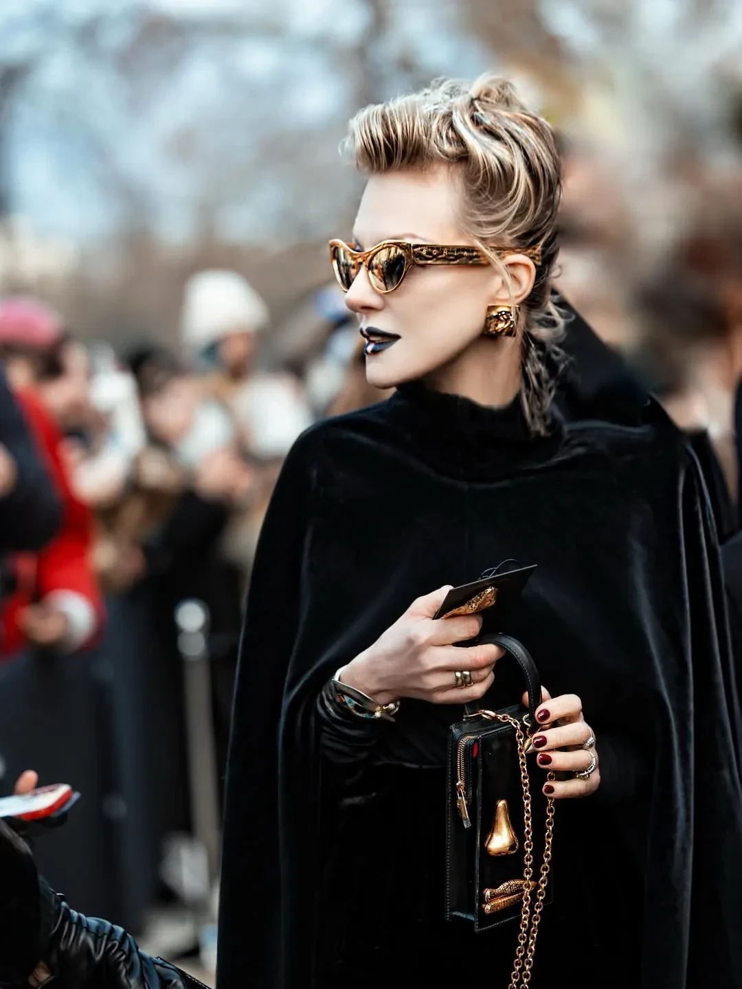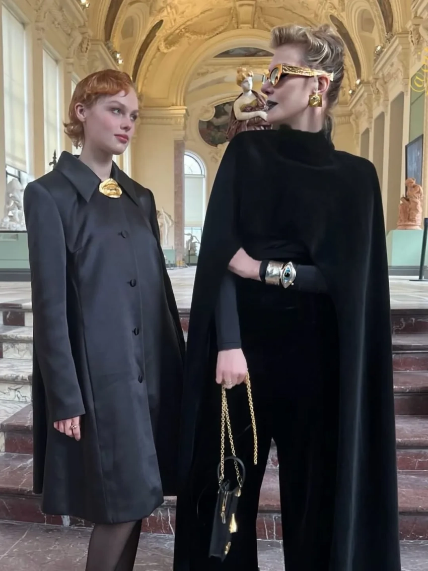 Рената Литвинова в чёрном кейпе и с макияжем в золотых тонах посетила шоу Schiaparelli, где встретилась со стилисткой Витой Клац. Снежанна Георгиева с дочерью Софьей посетили показ Valentino, где также были Оксана Бондаренко, Мария Богданович и многочисленные звёзды.